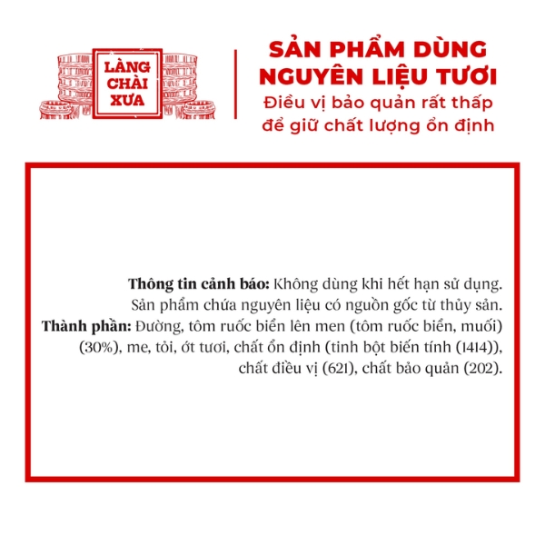 - Nguyên liệu: Thành phần chủ đạo là con ruốc biển tươi đánh bắt vào đúng mùa vụ. Ruốc được phối trộn cùng muối biển tinh khiết theo tỷ lệ vàng truyền thống. Con ruốc được phơi ráo và xay mịn, sau đó tiến hành ủ chượp tự nhiên. Quá trình này giúp enzyme thủy phân protein hoàn hảo, đảm bảo không tạp chất.