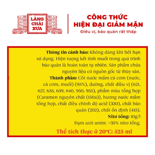 Nước mắm cá cơm ruột đỏ 525ml là dòng gia vị cốt nhĩ thượng hạng. Nước mắm này được ví như giọt ngọc của đại dương, nhờ sử dụng nguồn nguyên liệu cá cơm ruột đỏ quý hiếm. Trải qua quy trình ủ chượp gài nén truyền thống kéo dài lên đến 24 tháng. Sản phẩm mang đến hương vị đậm đà đặc trưng và hàm lượng dinh dưỡng vượt trội. Làng Chài Xưa đáp ứng hoàn hảo các tiêu chuẩn khắt khe về an toàn thực phẩm và giá trị ẩm thực Việt.