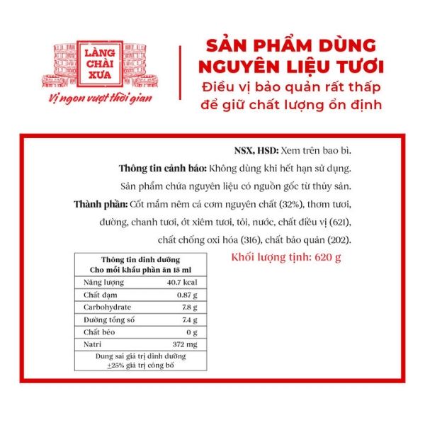 - Nguyên liệu: Thành phần chủ đạo là cá cơm tươi từ Phan Thiết, miền Trung. Cá được phối trộn cùng muối biển tinh khiết theo đúng tỷ lệ truyền thống. Quá trình lên men được kiểm soát chặt chẽ giúp vi sinh vật phát triển. Việc này tạo nên dòng mắm nêm nguyên chất và hoàn toàn không pha tạp.