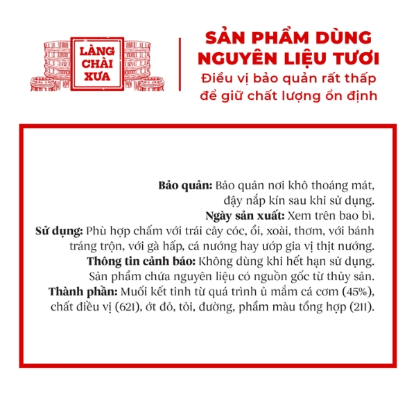 - Hương vị: Sản phẩm mang mùi thơm nồng nàn của cá cơm quyện cùng tỏi phi. Khi thưởng thức, vị mặn nhẹ nhàng bùng nổ cùng với độ cay vô cùng vừa phải. Hậu vị ngọt Umami sâu lắng từ đạm cá tự nhiên mang lại sự khác biệt. Hương vị này hoàn toàn vượt trội so với các dòng muối ớt công nghiệp thông thường.