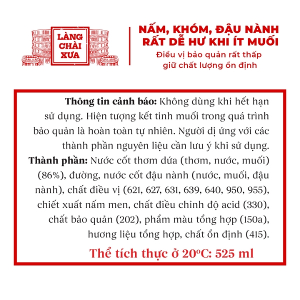 Nước mắm chay 525ml là giải pháp gia vị thực dưỡng vô cùng hoàn hảo. Sản phẩm kết tinh từ nguyên liệu thực vật quý giá qua quy trình lên men hiện đại. Làng Chài Xưa giữ trọn giá trị cốt lõi, mang đến hương vị thanh tao và dinh dưỡng lành mạnh. Đây là lựa chọn số một cho người ăn thuần chay, thực dưỡng và yêu lối sống xanh.